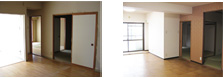 奥に1部屋があったため、暗くて昼でも電気を点けておかなければリビングを、奥の部屋との壁やムダな収納を取り払い1間続きに。 また、老朽化した床もフローリングから、足や腰に負担のかからない天然コルク仕様へ。天然コルクは、冬は暖かく、夏は涼しく、体にもやさしいものを選びました。 ペットも喜んで走り回っています。 |